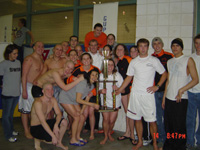 *If you are wondering why the trophy in my hand is a bit shorter than the other one about think about this, 22 swimmers and 2 coaches jumping in a pool with it....well at least we were able to fix it.